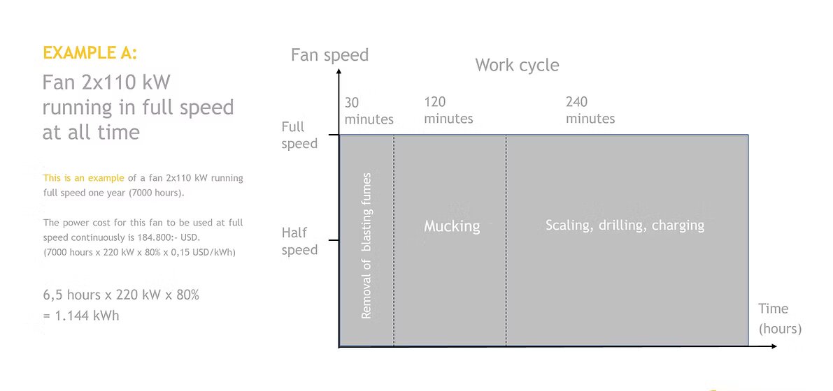 After the blasting fumes are out, the mucking commences and also during this event, the fan is run in full speed since normally, a large amount of diesel fumes from trucks and loaders is polluting the air. (this normally takes 90-150 minutes) After the mucking is completed the scaling, drilling and charging takes place and for these works, the fan speed is reduced to half speed. These works totally takes 180-240 minutes.