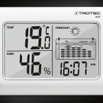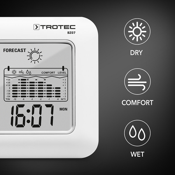 Гистограмма индикатора BZ07 представляет интерес для мониторинга изменения температуры за последние 12 часов. В качестве дополнительной услуги встроенный дисплей прогноза погоды показывает вам, как, по прогнозам, будет развиваться погода с помощью 4 графиков. Широкий спектр функций дополняется отображением времени или даты и функцией будильника с кнопкой повтора сигнала.