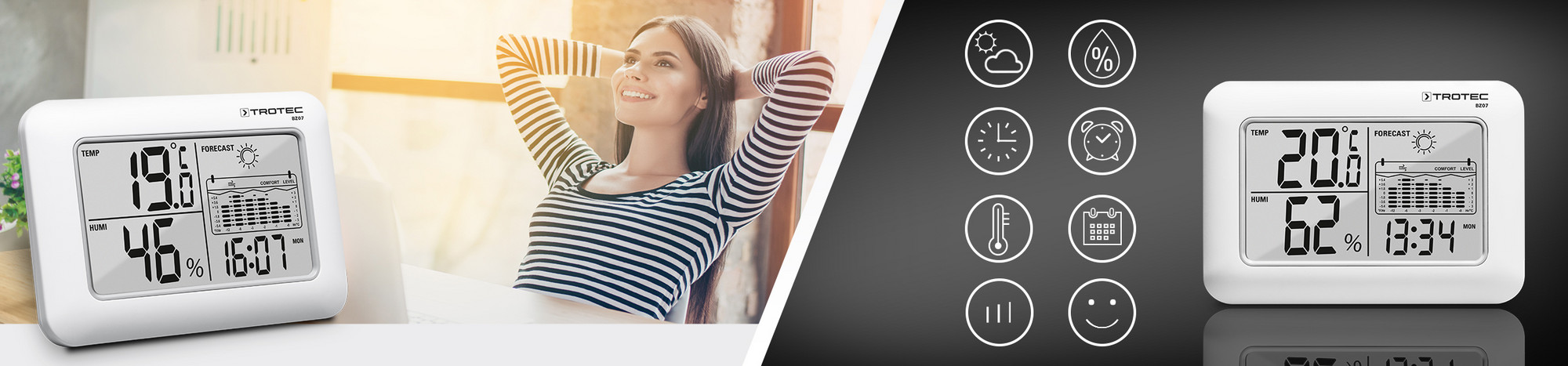 Слишком тепло, слишком холодно, слишком влажно или слишком сухо — у каждого свое ощущение. С BZ07 вы всегда имеете обзор климата в помещении и можете сознательно изменять условия к лучшему на основе измеренных значения для того, чтобы чувствовать себя хорошо в целом.